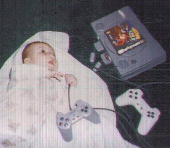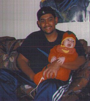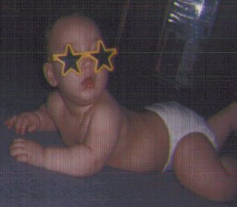 He loves to play peek a boo with a blanky, smiles at himself in the mirror, and today, April 20, 2000 when he turned 9 months old, he took his first independent step but fell down and tried only once more. He is trying to cut 4 teeth at once right now and gets quite fussy when they are bothering him. He love to grab your face with both hands holding your cheeks and opens his mouth wide and plants a big slobbery kiss on your cheeks. He will do one and then the other one, as he concentrates real hard while he is turning your face to kiss the other cheek he has his tongue hanging out and he looks very focused. It is so cute! He still looks identical to his mommy, Marie and we started calling him Mini-Marie or as she calls him, Mini-Me (after the character in Austin Powers' second movie when he has a himself cloned and a little midget who looks just like him is born and he names him Mini-Me - the name of the movie is "The Spy Who Shagged Me." Really funny!